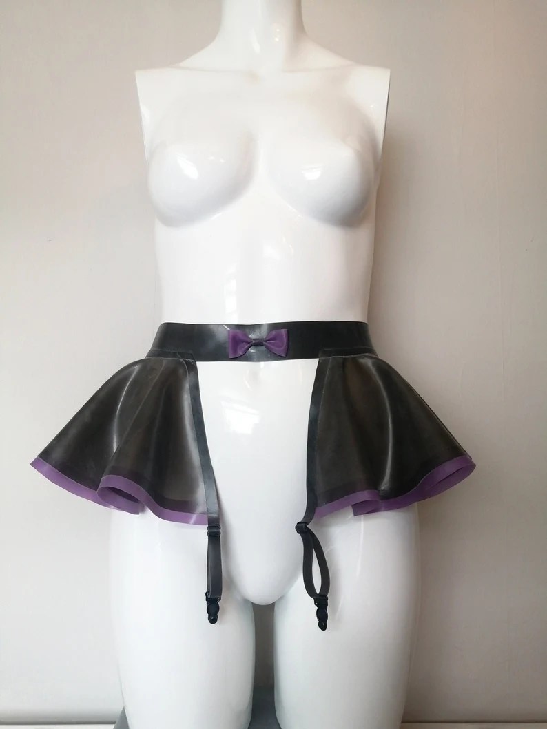 The style of this latex skirt is a perfect fusion of playful allure and sensual sophistication. The high-waisted, pleated mini-skirt cut is both flattering and flirty, while the purple trim and bow add charming details. The integrated garter straps elevate the piece from a simple skirt to a complete lingerie or fetish-wear item.